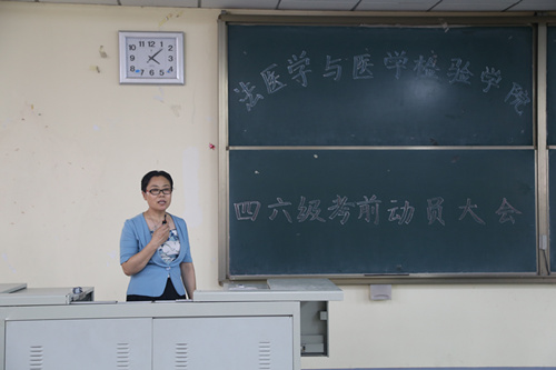 为了鼓舞同学们的士气,坚定考试信心,法医学与医学检验学院于6月12日下午四点在教学楼411举行四六级考试考前动员大会,院党总支书记郑红,辅导员孟阳老师出席了本次大会。 首先,郑红书记强调了考试纪律,倡导“以诚信考试为荣,以考试舞弊为耻”,坚决抵制考试作弊歪风,号召全校同学在即将到来的全国大学英语四、六级考试中自觉遵守考场纪律,坚决杜绝各种考试舞弊行为,净化考场环境,展现自我的真实水平,用真实的成绩证明自己的实力。郑红书记的讲话赢得了在场同学的精彩掌声。接下来2013级检验一班的苏俐心同学上台领誓,全体考生进行诚信考试宣誓。 通过此次考前动员大会,加深了同学们对诚信考试的理解,有助于良好的考试氛围,增强我院的学风建设。这次四六级考前动员大会受到了同学们的一致好评,达到了预期的效果。