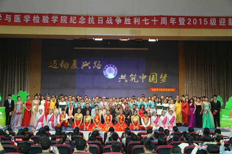 2015年11月13日,法医学与医学检验学院学生会承办的“迈向复兴路,共筑中国梦”——纪念抗日战争胜利70周年暨2015级迎新晚会在图文信息楼五楼报告厅成功举办。特邀嘉宾抗战老兵王琴、法医学与医学检验学院院长崔文、党总支书记郑红、副院长张凯、全体辅导员及2015级全体新生观看了本场晚会。 晚会分为三个篇章:激情的岁月、复兴中国梦、迈向新时代 。一曲《天耀中华》掀开了第一个篇章,红歌连唱和抗战舞蹈《八女投江》更是将全场观众拉回了那段可歌可泣的岁月,激起了我们对祖国无限地热爱。民谣《同桌的你》让同学们回忆起那些校园往事。法医专业话剧《死人不说谎》不仅让新生们了解了法医的职责,也让他们对专业有了更多的认识。随后的热舞《怦然心动》沸腾全场。最后,晚会在张会存老师的《走向复兴》中达到了最后的高潮。本场晚会主题鲜明、催人奋进;晚会高潮迭起,为到场的所有观众奉献了一场听觉和视觉的盛宴。 此次迎新晚会充分地展示了同学们的才艺,更充分地表达了学院全体师生对2015级新生的欢迎与祝福。 |