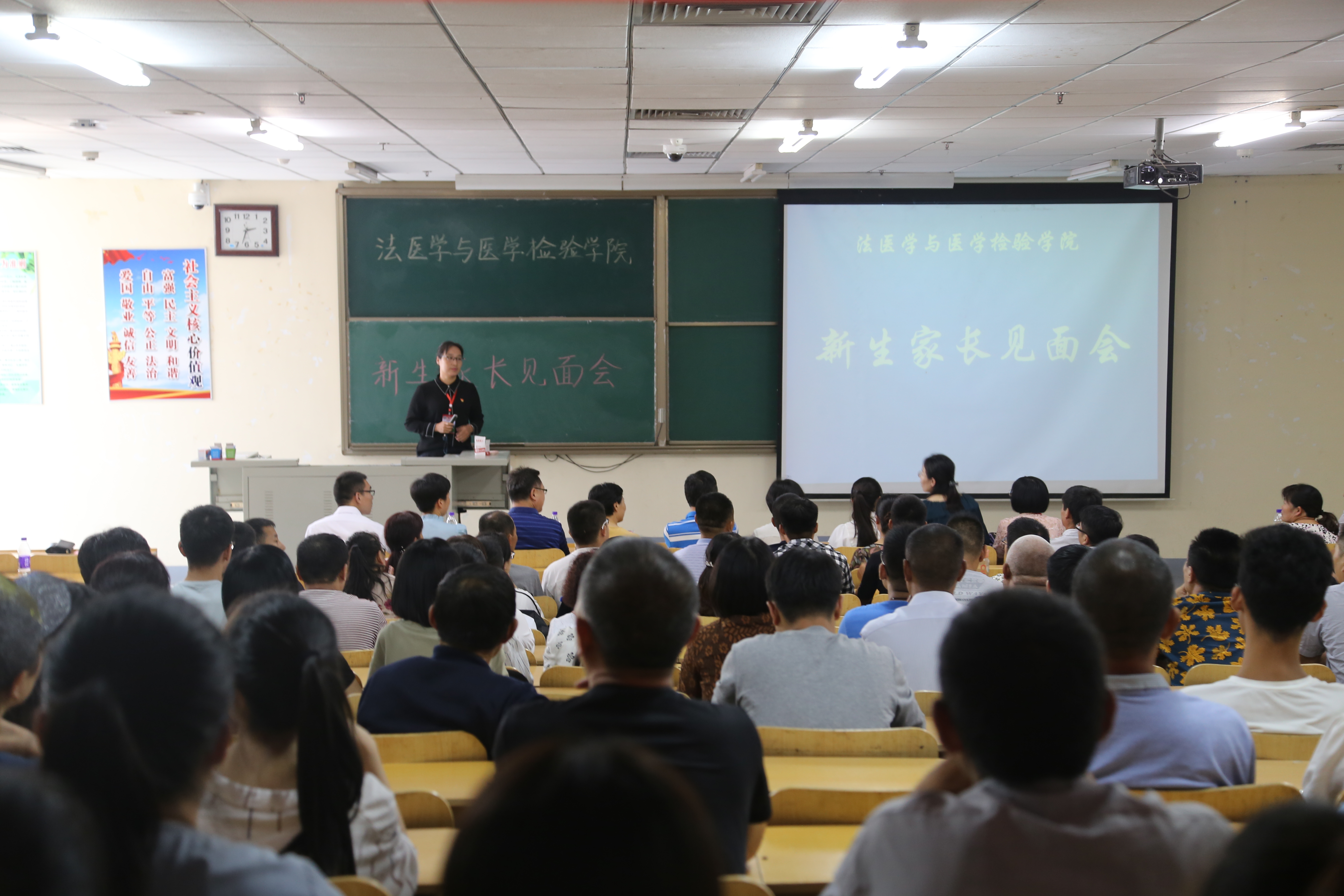 2018年9月8日,法医学与医学检验学院2018级新生家长见面会在我校太白湖校区教学楼201教室举行。法医学与医学检验学院党总支书记郑红、副院长张凯、党总支副书记秦茂森出席了此次活动。学院全体辅导员老师、2018级各班班主任和部分新生家长参加了本次见面会。学生管理科科长郭娜主持会议。 张凯代表学校对各位新生家长的到来表示热烈的欢迎与感谢,并从学院发展和基本情况、培养定位与目标、师资队伍建设、教学资源与条件、学分制改革以及学生发展与就业等六方面介绍了我院各项工作的开展情况,使新生家长对我院的专业和发展有了进一步的了解。最后,张凯期望广大家长与学院齐心协力,尽快帮助新生完成角色转变,激励他们奋发向上,再创佳绩。 郭娜就学生日常管理和安全等事项与家长进行交流。 本次新生家长见面会,架起了学校与家长的沟通桥梁,为家校互动、共促学生成长成才提供必要条件,为今后教学管理工作的顺利开展奠定了基础。