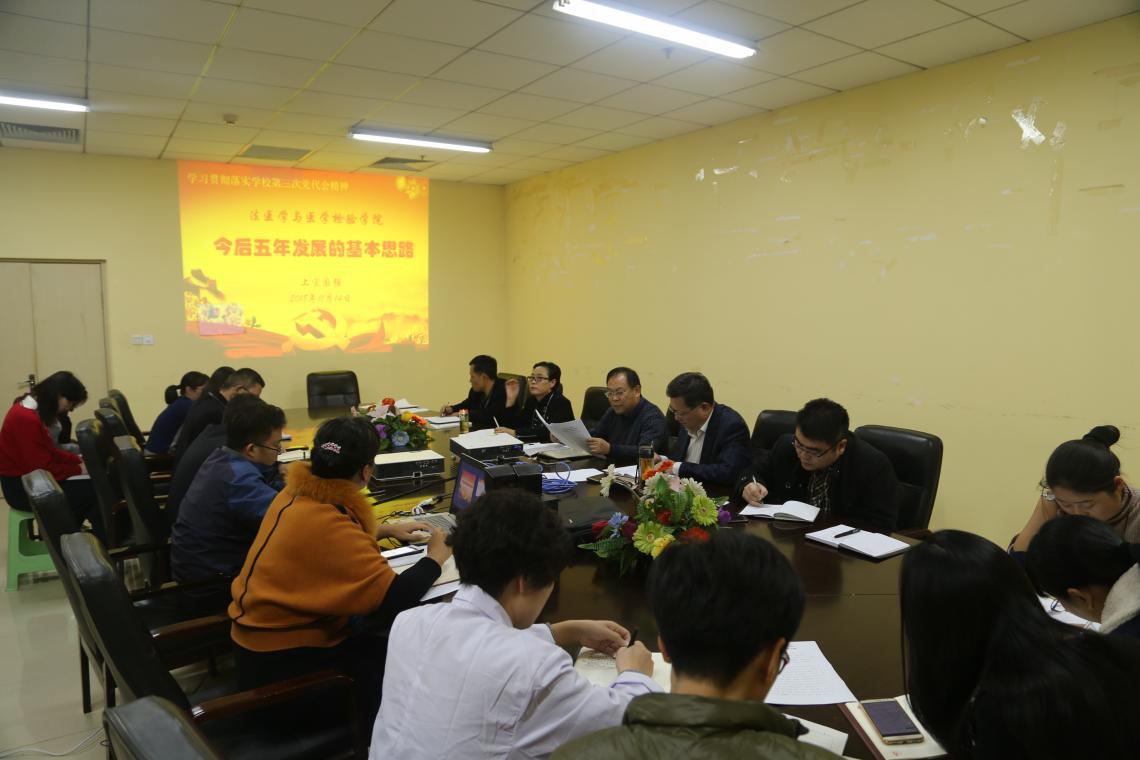 11月14日,法医学与医学检验学院召开《贯彻落实学校第三次党代会精神,开创法检学院各项工作新局面》为主题的全体教工会议。院长上官国强,党总支书记郑红,副院长张凯,副书记秦茂森及全体教工参加了本次会议。会议由上官国强主持。 郑红首先传达了学校第三次党代会精神,对我院目前开展的“讲梦想、讲信念、讲教学、讲科研、讲服务”五讲系列活动进行总结,对下一阶段的党建工作进行部署。上官国强结合本次党代会报告,对学院今后各项工作的开展进行规划并提出要求。上官院长指出,未来五年,我院要继续深化教学改革,着手开展特色专业建设,教学基本条件建设和师资队伍建设工作,积极开展学术交流活动,打造高水平教学团队,建成一流学科,同时注重学院特色文化建设,引领先进文化。王业全副教授做了题为《学习校党代会精神—法医学永远在路上》的专题报告,并就专业建设等内容与教师进行了交流。 本次会议为学院今后五年的工作指明了方向,要求全体教职人员进一步认真学习、贯彻落实第三次党代会精神,圆满完成各项工作任务,为全面建成特色鲜明、国内知名应用型现代医药科技大学贡献自己的力量。