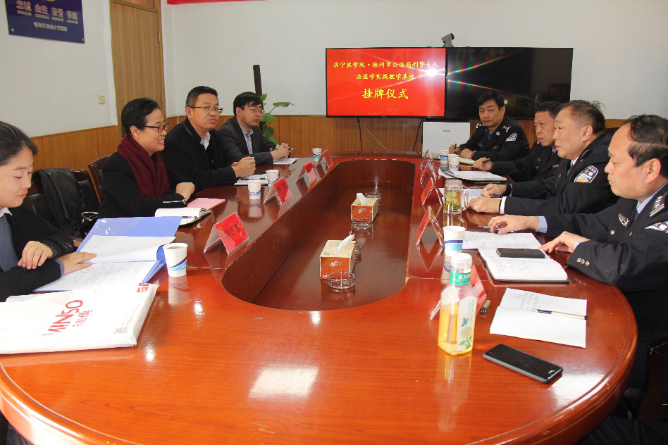 11月21日,我校在徐州市公安局刑警支队举行实践教学基地签约挂牌仪式。法医学与医学检验学院党总支书记郑红、实践教学管理处规划建设科科长王忠华、济宁医学院司法鉴定中心李长征出席了签约仪式并向实习单位授牌。 郑红书记首先介绍了我校和我院的基本情况以及在人才培养和加强实践教学等方面的各项举措,充分肯定了各实践教学基地一流的工作条件、严格的管理制度和规范的操作流程,向实习基地近年来对我校实践教学工作的大力支持表示了衷心的感谢。徐州市公安局政委李玉祥同志对本单位的基本情况作了介绍,包括当前的刑事技术科室组成、每年的案件种类及数量、法医室的基本工作等内容,并对我校实习生的工作表现给予高度评价。此外,我院领导与实习基地负责人在科研合作、人才深入培养等方面达成了一致意见。本次签约挂牌工作圆满完成,双方都期望进一步的合作交流。