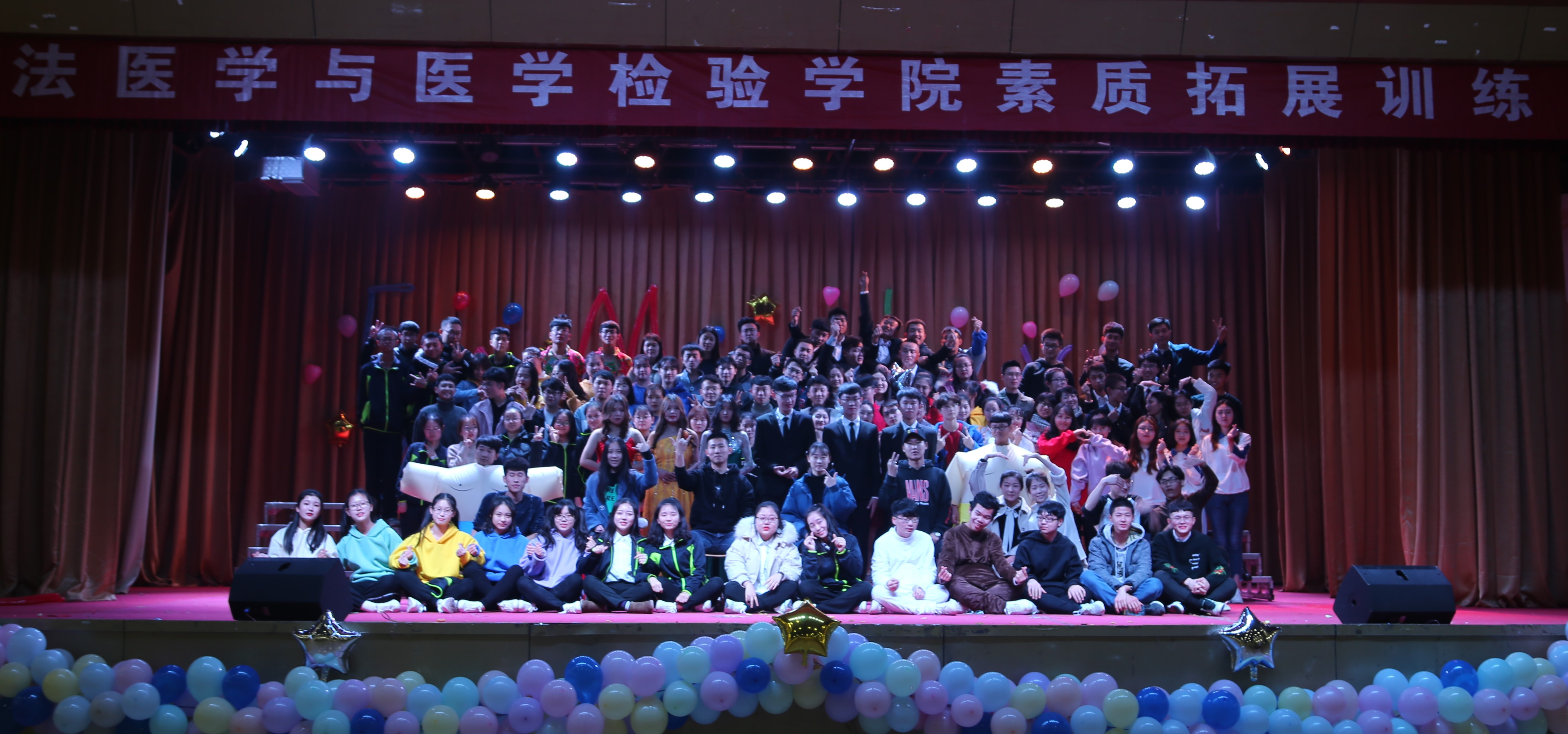 2018年12月18日晚,由法医学与医学检验学院举办的以“坚持初心,团结共进”为主题的学生会素质拓展大会在大学生活动中心举行。 活动在组织部与纪检部合作的开场舞中拉开帷幕,随着一波紧张的抽红包环节现场气氛瞬间推向高潮。随后各部门的精彩节目轮番上演,其中干事们的精彩表现让大家眼前一亮,接地气的花袄花裤、搞怪的男扮女装、夸张的舞蹈动作、炫酷的荧光表演……一次次燃爆全场。表演期间穿插了几个小游戏,“几手几脚”、“交头接耳”“WE ARE 伐木累”、“发呆比赛”等趣味横生,大家全情投入游戏,群策群力,不甘落后于其他组,即使输掉游戏接受惩罚也甘之如饴。大会接近尾声,外联部为我院学生会全体成员送上了细心定制的伴手礼,大家深深地感受到了法检学院学生会这个大家庭的温暖与贴心。活动在学生会主席李迪超的闭幕词与学生会精心制作的影集视频中告一段落。 法医学与医学检验学院全体学生会成员参加活动。