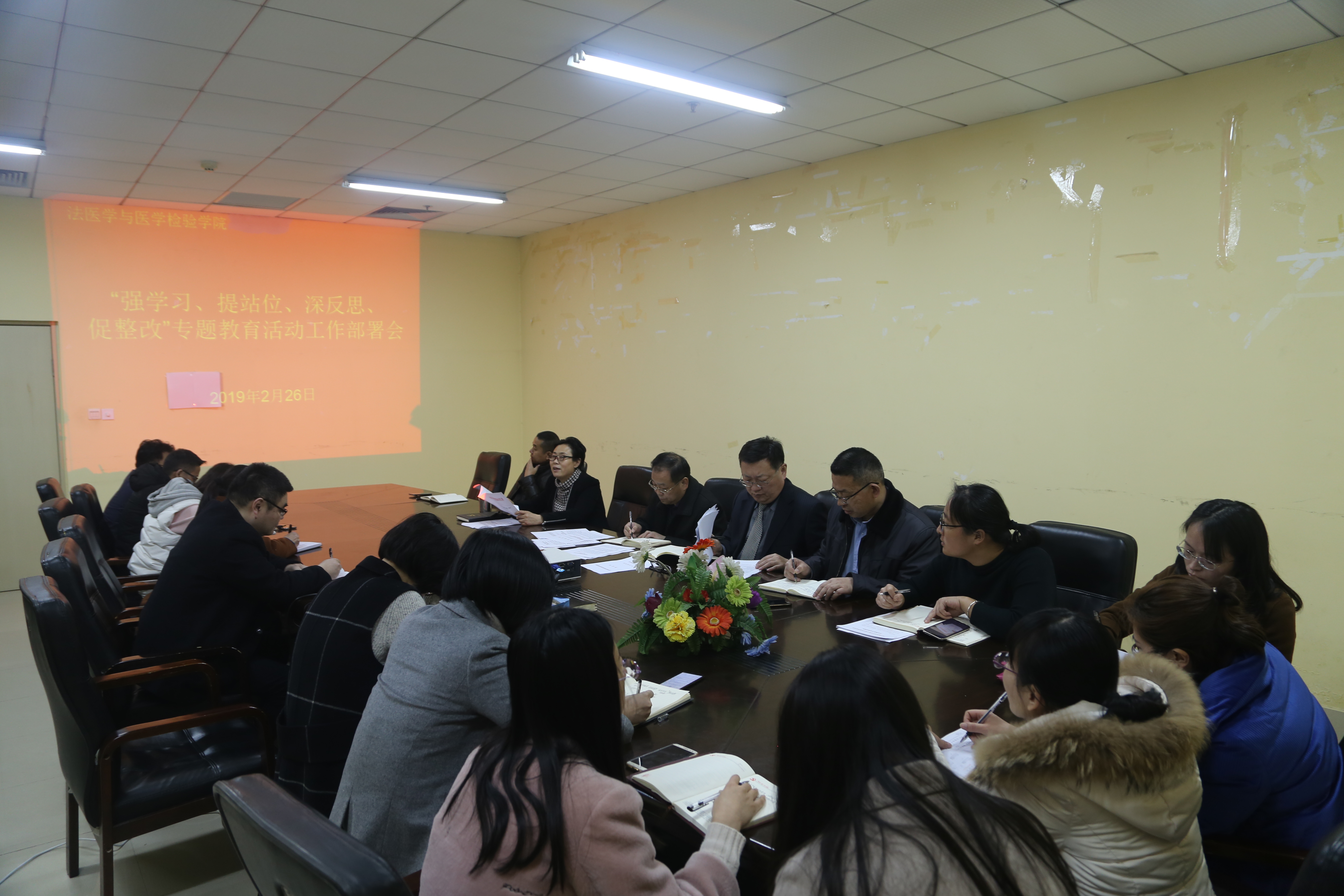 2019年2月26日,法医学与医学检验学院在太白湖校区447会议室召开“强学习,提站位,深反思,促整改”专题教育活动工作部署会。党总支书记郑红,院长上官国强,副院长张凯,副书记秦茂森与全体教职人员参加了本次会议。会议由郑红主持。